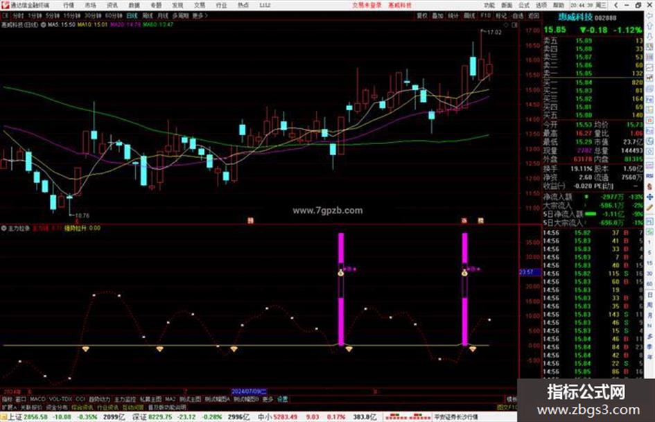 当满足条件强势拉升时,在0和16位置之间画柱状线,宽度为2,0不为0则画空心柱.,COLORFF00FF
