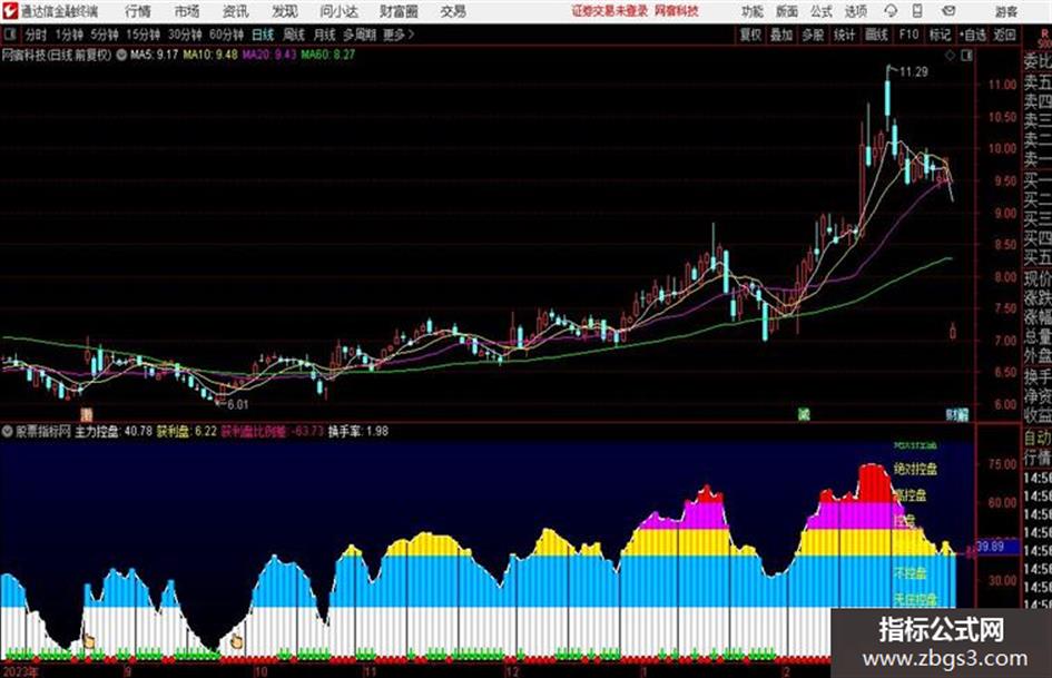 STICKLINE(主力控盘 AND 主力控盘>40,40,主力控盘,0.5,0),COLOR00FFFF;