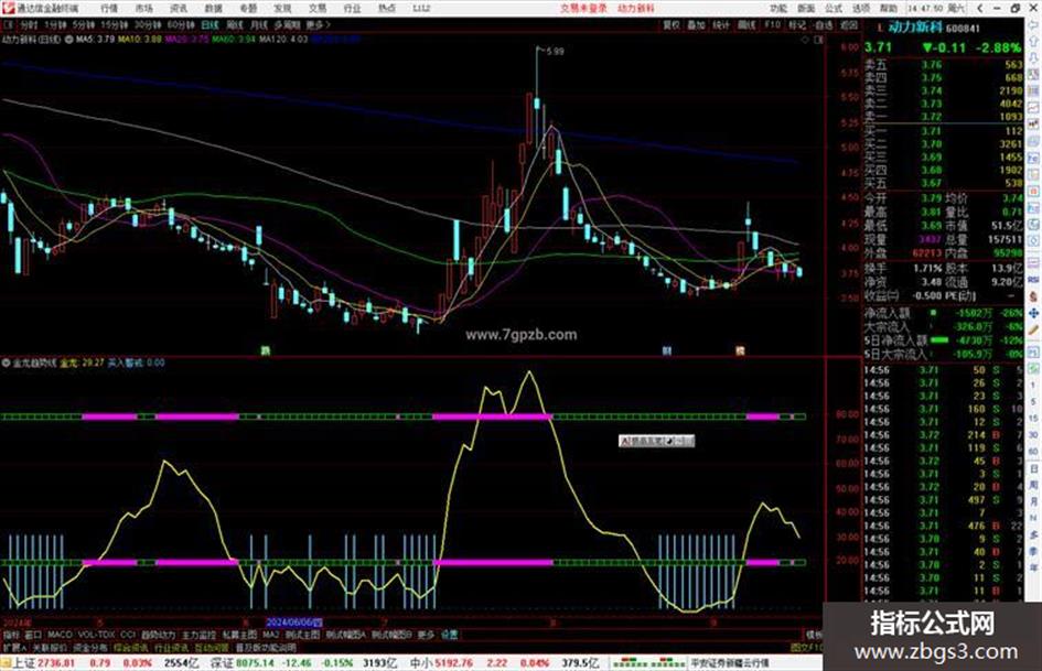 {指标介绍:金龙线,也就是黄线,这是一条趋势线,曲线下穿20,就是到了一个底部的趋势,上穿18即可准备抄底。}
