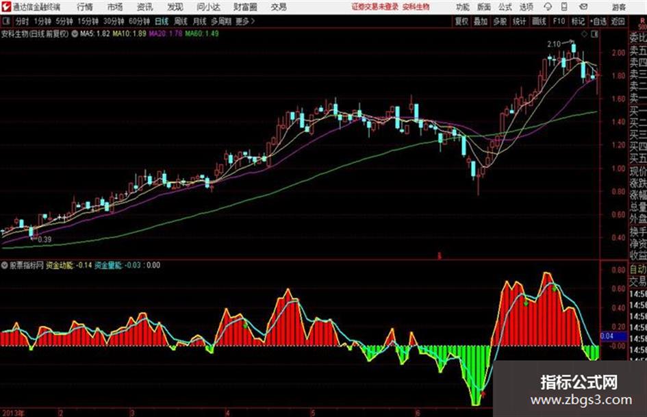 资金筹码度 这是一款运用资金筹码集中度来的指标公式,图形简洁直观,0轴之上出现红柱, 黄线(资金动能)蓝线(资金量能)同时向上,特别是在0轴之上黄线蓝线金叉向上更佳,可结合其它指标适时介入。下图是运用指标公式{资金筹码度}示例: