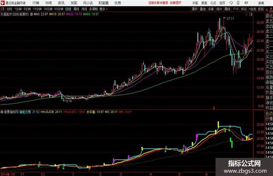 HHJSJDA:=(3*CLOSE+OPEN+LOW+HIGH)/6;HHJSJDB:(20*HHJSJDA+19*REF(HHJSJDA,1)+18*REF(HHJSJDA,2)+17*REF(HHJSJDA,3)+16*REF(HHJSJDA,4)+15*REF(HHJSJDA,5)+14*REF(HHJSJDA,6)+13*REF(HHJSJDA,7)+12*REF(HHJSJDA,8)+11*REF(HHJSJDA,9)+10*REF(HHJSJDA,10)+9*REF(HHJSJDA,11)+8*REF(HHJSJDA,12)+7*REF(HHJSJDA,13)+6*REF(HHJSJDA,14)+5*REF(HHJSJDA,15)+4*REF(HHJSJDA,16)+3*REF(HHJSJDA,17)+2*REF(HHJSJDA,18)+REF(HHJSJDA,20))/210,COLORYELLOW;HHJSJDC:MA(HHJSJDB,6),COLORRED;日线:=MA(CLOSE,60),COLORBLUE;