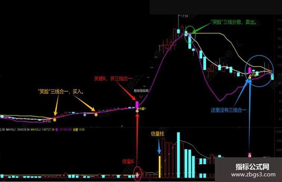 2、主图"三线合一"出"笑脸"买入信号,"三线分散"出"哭脸"卖出信号;