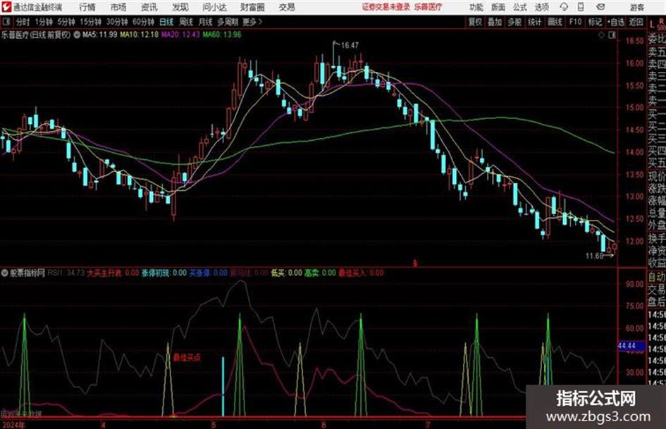 低买:IF(TROUGHBARS(3,6,1)=0 AND HIGH>LOW+0.04,50,0),COLOR00FFFF,LINETHICK1;
