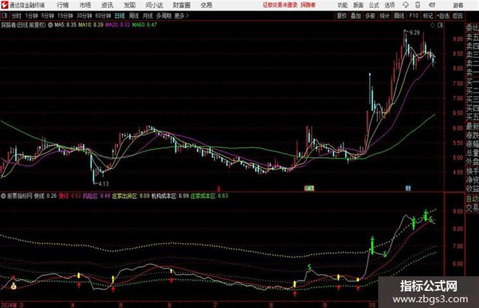 STICKLINE(C>=庄家成本区 AND REF(C,1)<庄家成本区 AND REF(C,2)>庄家成本区,L,H,0.2,0),COLORRED;