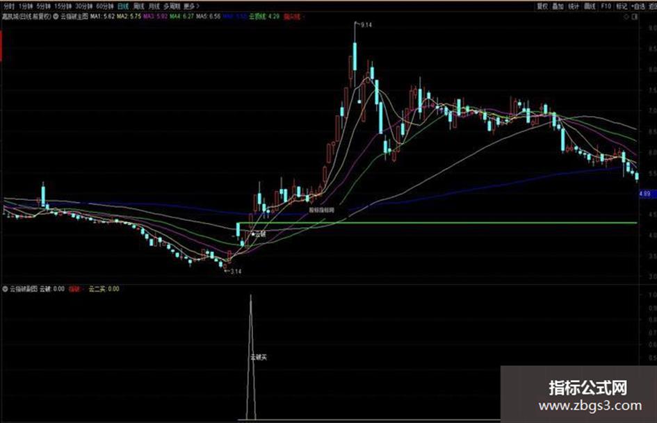 2、指破公式原理就是前面K线峰顶出现过避雷针(也就是长上影线)后股价开始下跌,经过一段时间的整理后股价又开始上涨,突然有一天股价突破前面的峰顶长上影的最高价,此时就会出现云破的信号(包括突破回落,信号也不会消失)。