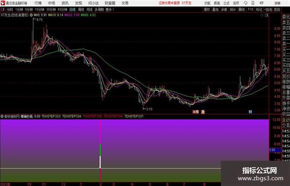 输出TDXSTEP310:当满足条件如果精确抄底,返回(-120),否则返回0时,在9和0位置之间画柱状线,宽度为7,0不为0则画空心柱.,COLOR770077