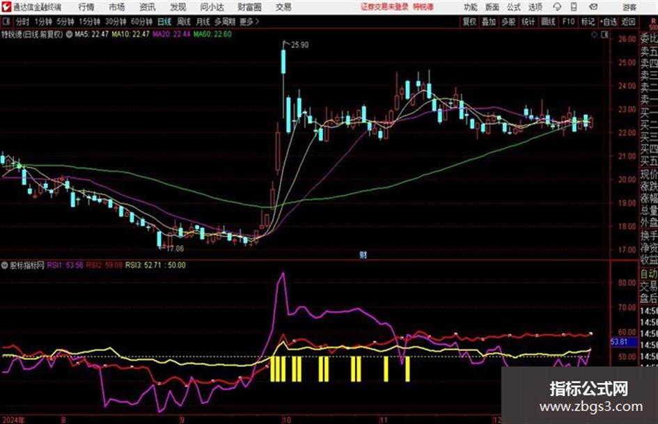 STICKLINE(C>MA(C,60) AND MA(C,60)>REF(MA(C,60),1) AND RSI3>45 AND RSI2>RSI3 AND RSI1>RSI2 AND RSI1>REF(RSI1,1),50,40,2,0),COLORYELLOW;