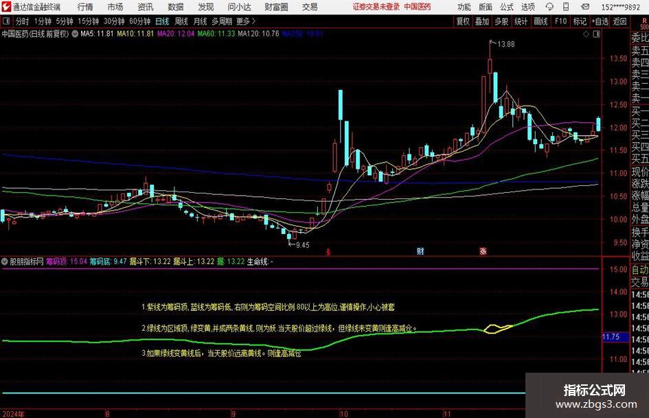 1.紫线为筹码顶, 蓝线为筹码低, 右则为筹码空间比例.80以上为高位,谨慎操作,小心被套