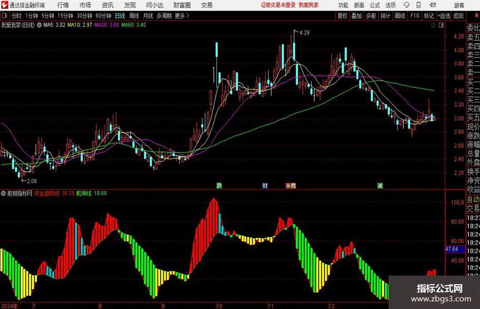 弱势反弹:STICKLINE(资金趋势线<乾坤线 AND 资金趋势线>(REF(资金趋势线*0.95,1)),资金趋势线,乾坤线,2,0),COLORYELLOW;