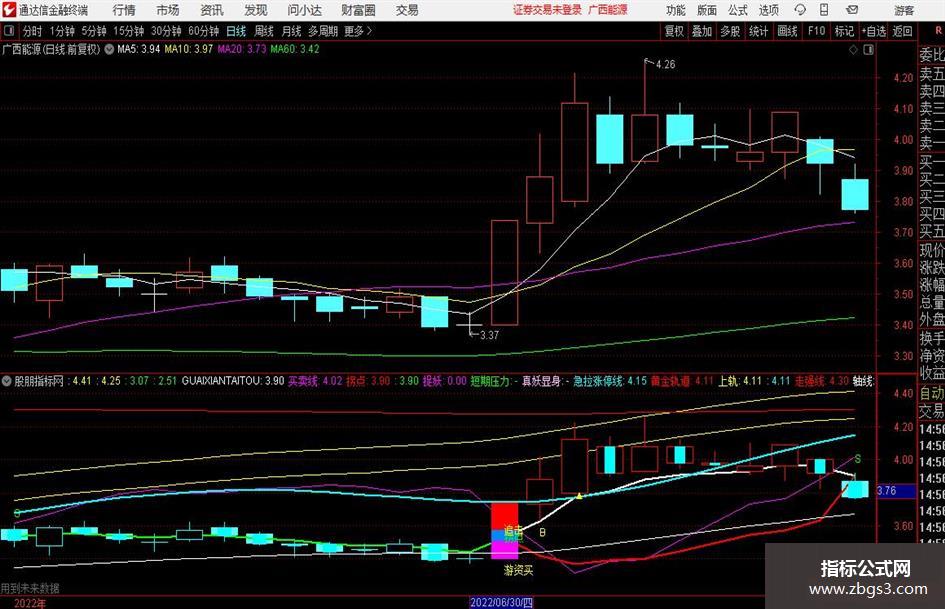 买卖线:REVERSE(A13) + 2 * A6, , COLORMAGENTA;DRAWTEXT(ISLASTBAR,买卖线,'上穿卖下穿买'),COLORMAGENTA ;