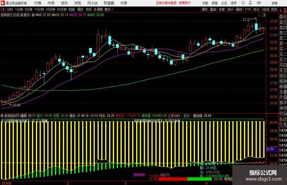 STICKLINE(TIME=931 OR TIME=1000,上穿分时,底支,0,-1),COLORLIBLUE;分时上突:=CROSS(C,上穿分时);上突:=C<上穿分时 AND 上穿分时>底支;DRAWICON(分时上突,C,5);股价支撑线:=MA(CLOSE,20);