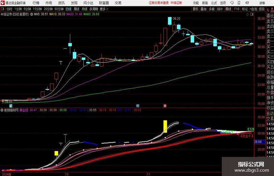 【有金矿】:=COUNT(CLOSE<黄金线,5)=4 AND CLOSE/黄金线>1.004 AND