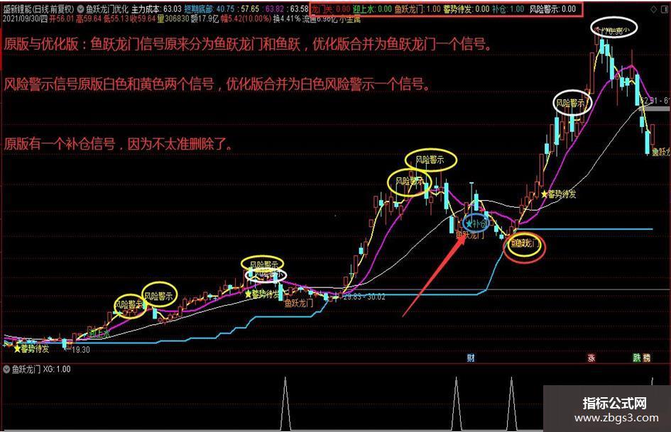 原版鱼跃龙门主图的操作信号比较多,优化版合并了两个操作信号,删除了一个操作信号。比如鱼跃龙门信号原来分为鱼跃龙门和鱼跃,优化版合并为鱼跃龙门一个信号。风险警示信号原来分为白色和黄色两个信号,优化版合并为白色风险警示一个信号。