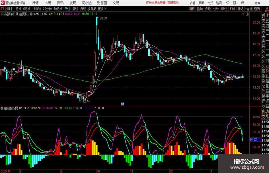 当满足条件(K-D)*2<0AND(K-D)*2<1日前的(K-D)*2时,在(K-D)*2和0位置之间画柱状线,宽度为1.5,0不为0则画空心柱.,COLOR00B500
