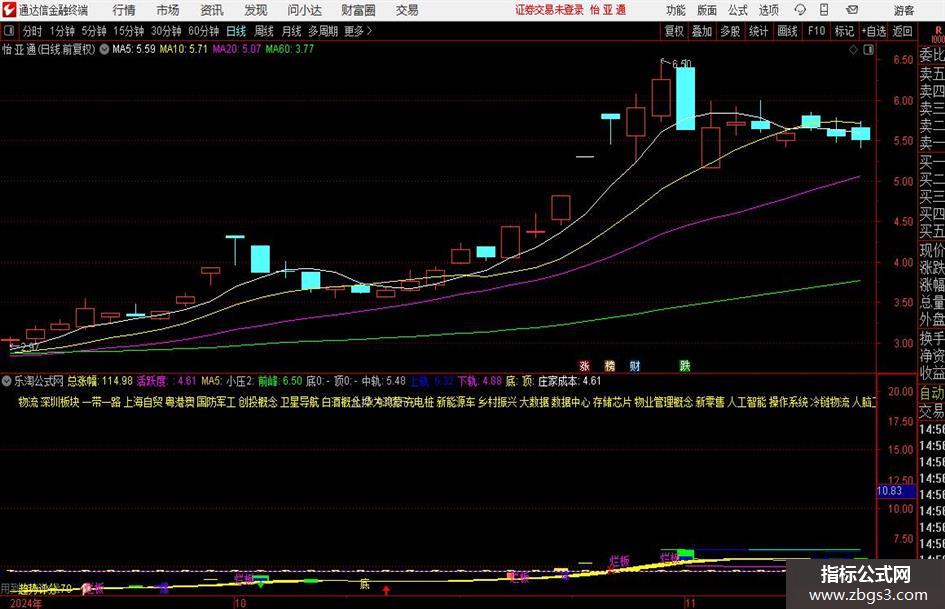 SN1:=(L+H)/2;N5:=IF(BARSCOUNT(C),SMA(SN1,3,1),C),COLORWHITE,DOTLINE;N3:=IF(BARSCOUNT(C),SMA(SN1,21,1),C),COLORYELLOW;MA5:MA(C,5)LINETHICK2,COLOR00CCFF;五日乖离率:=(C-MA5)/MA5*100;BB5:=ATAN((MA5/REF(MA5,1)-1)*100)*180/3.1416;速度5:=SMA(EMA((MA5-REF(MA5,1))/REF(MA5,1),3)*100,3,1);加速度5:=EMA((速度5-REF(速度5,1)),3),NODRAW;IF(BB5>30 AND MA5>REF(MA5,1),MA5,DRAWNULL),LINETHICK2,COLORRED;IF(BB5<0 AND MA5<REF(MA5,1),MA5,DRAWNULL),LINETHICK2,COLORGREEN;