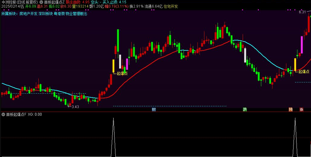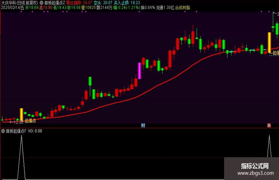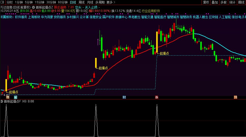 7、涨停板以淡紫色特别标注,跌停板则呈现为灰白色,“起爆点”信号的K线以黄色高亮显示,并辅以起爆点标注;