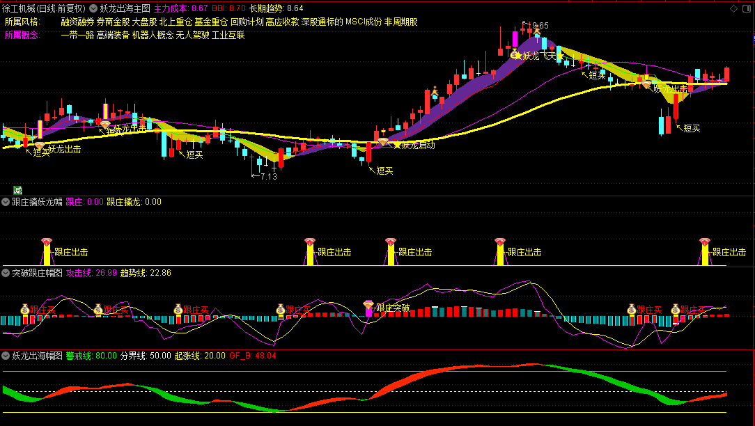 2. 跟庄擒龙信号为多信号强震信号,股价底部出现大涨概率高。