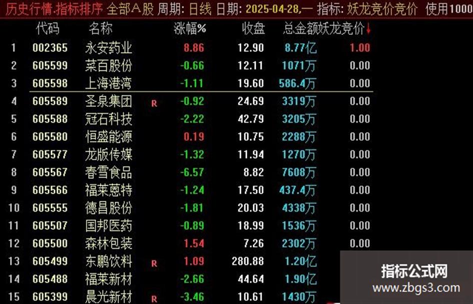 竞价时段结束后的9:25-9:30期间,输入“.401”快捷键进入指标排序界面,将排序指标切换为【妖龙竞价排序】公式。