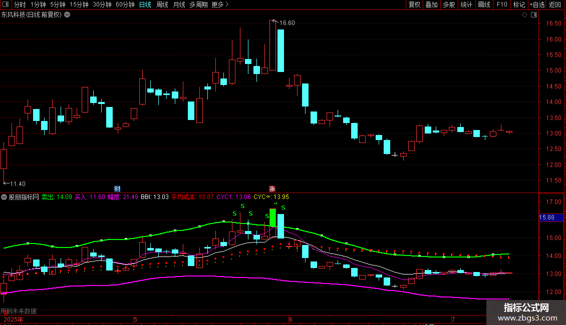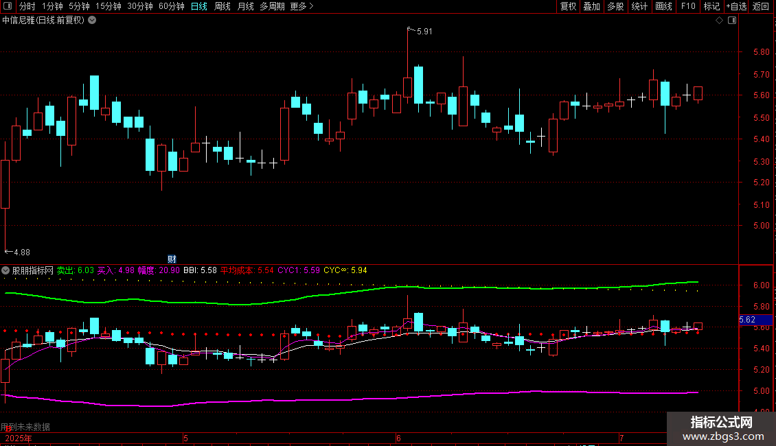 输出CYC∞:如果JJJT,返回以100*成交量(手)/流通股本(股)为权重成交额(元)/(100*成交量(手))的动态移动平均,否则返回(最高价+最低价+收盘价)/3的120日指数移动平均,POINTDOT,COLOR00FFFF,线宽为2
