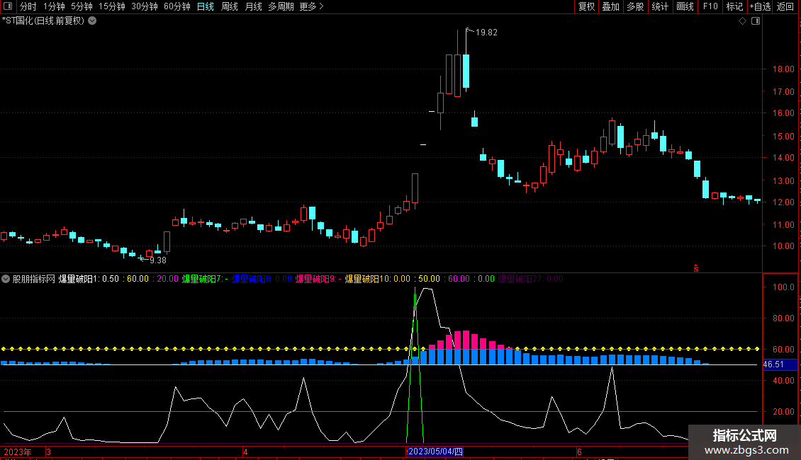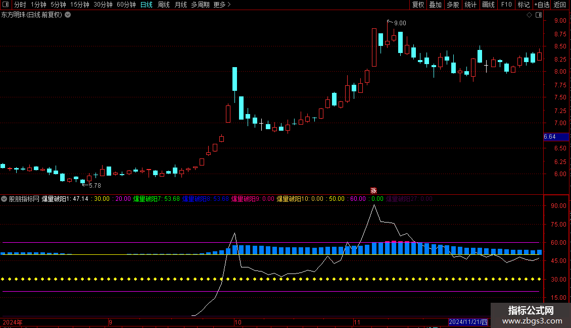 当满足条件爆量破阳7>=80时,在80和爆量破阳7位置之间画柱状线,宽度为2.5,0不为0则画空心柱.,COLOR38CBF5