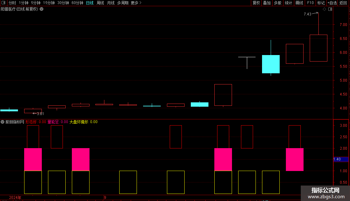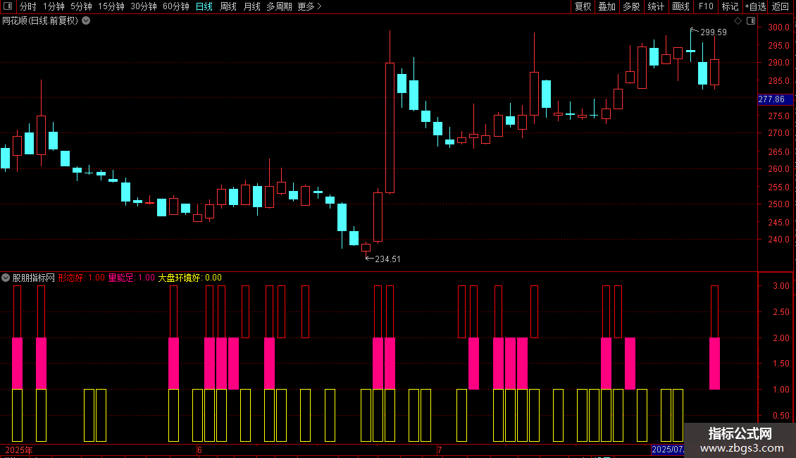 形态好:当股价突破5/8/24/55/60/75/120/188/240日均线时触发(红色信号)