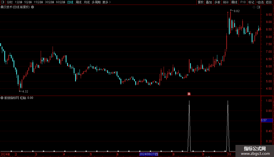 VAR1:=CLOSE/REF(CLOSE,1)>=1.098 AND C=H;VAR22:=COUNT(VAR1,2)>=1 AND NOT(COUNT(VAR1,3)>=2);妖启:=FILTER(VAR22,13),COLORDDDDDD;红钻:妖启 AND COUNT(妖启,18)=1;