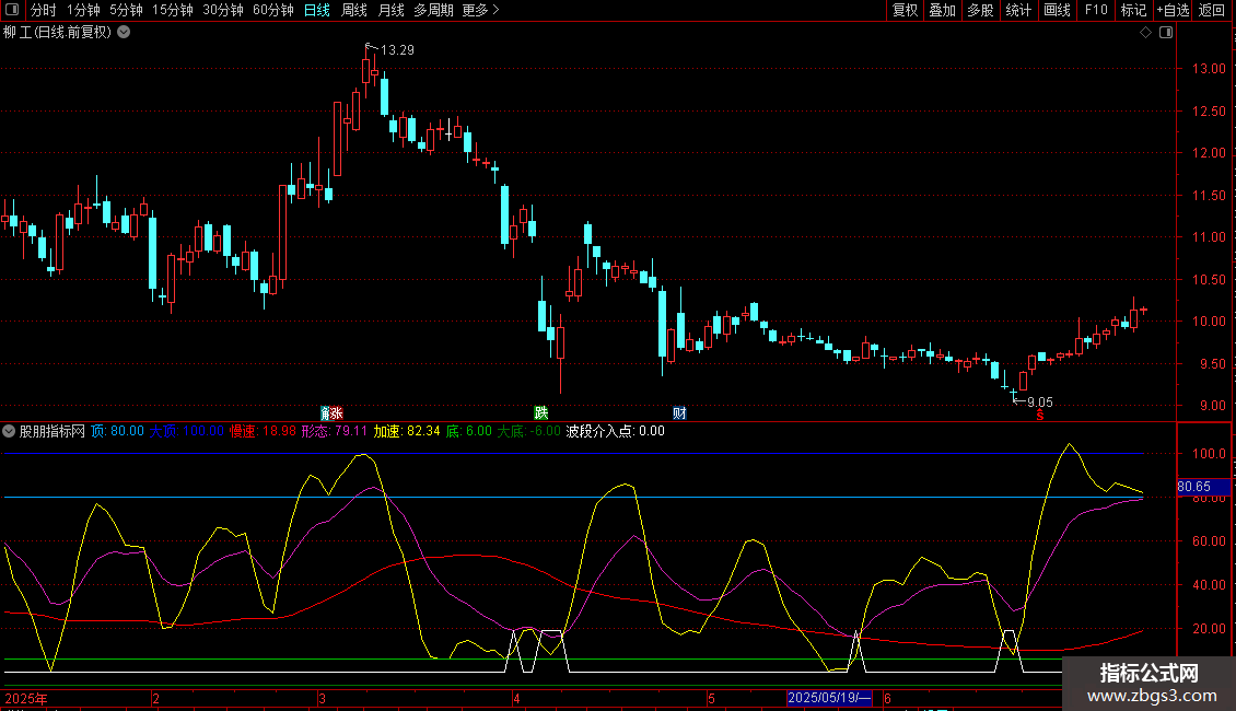 波段介入点:IF(A2<19,19,0)COLORWHITE;