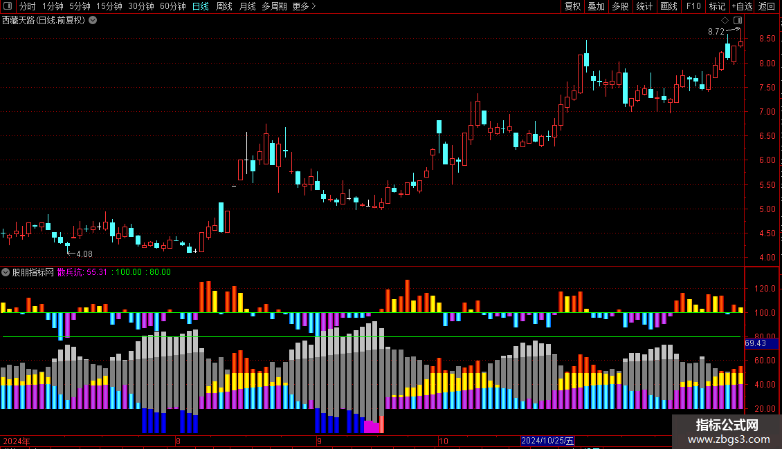 STICKLINE(ZZLKP>80,ZZLKP,ZZLKP-(ZZLKP-80)/2,0.5,0),COLOR00FF00;
