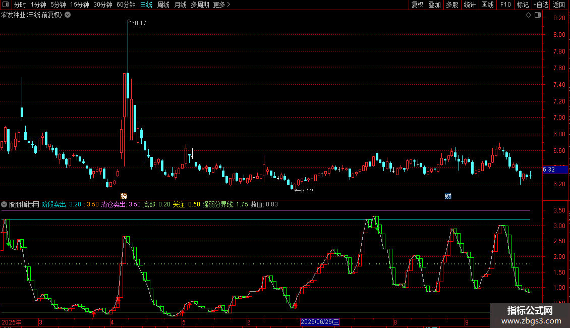 VAR2:=LLV(LOW,10); VAR3:=HHV(HIGH,25); 阶段卖出: 3.2,COLORC6C600; 3.5,COLOR0088FF; 清仓卖出: 3.5,COLORFF75FF; 动力线:= EMA((CLOSE-VAR2)/(VAR3-VAR2)*4,4); STICKLINE(动力线>REF(动力线,1) ,动力线 ,REF(动力线,1),3 ,1),COLORRED; STICKLINE(动力线<=REF(动力线,1) ,动力线 ,REF(动力线,1),3 ,1),COLOR00FF00; 底部:0.2,COLOR70DB93; 关注:0.5,COLORYELLOW; DRAWICON( FILTER(CROSS(动力线,关注),20),动力线+0.02 ,1); DRAWICON( FILTER(CROSS(清仓卖出,动力线),20),动力线+0.02,2); DRAWICON( FILTER(CROSS(动力线,底部),20),动力线+0.02 ,1); DRAWICON( FILTER(CROSS(阶段卖出,动力线),20),动力线+0.02,2); 强弱分界线:1.75,POINTDOT,LINETHICK2,COLOR70DB93; 数值:动力线,COLORA8A8A8;