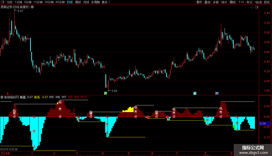 {共享临界MACD}DIF:=EMA(CLOSE,12)-EMA(CLOSE,26);DEA:=EMA(DIF,9);MACD:=(DIF-DEA)*2,COLORSTICK;W1:STICKLINE(MACD>0,MACD,0,2,1),COLORRED;W2:STICKLINE(MACD<0,MACD,0,2,0),COLORCYAN;VA1:=HHVBARS(MACD,BARSLAST(MACD<0)+1);VA2:=CROSS(BACKSET(CROSS(0,MACD) OR (ISLASTBAR AND MACD>0),REF(VA1,1)+2),0.5);前高:DRAWLINE(VA2,MACD,REF(VA2,1),REF(MACD,1),1),COLORWHITE;VA3:=LLVBARS(MACD,BARSLAST(MACD>0)+1);VA4:=CROSS(BACKSET(CROSS(MACD,0) OR (ISLASTBAR AND MACD<0),REF(VA3,1)+2),0.5);前低:DRAWLINE(VA4,MACD,REF(VA4,1),REF(MACD,1),1),COLORYELLOW;W3:STICKLINE(MACD>0 AND MACD>前高 AND 前高>0,MACD,前高,2,0),COLORYELLOW;W4:STICKLINE(MACD<0 AND MACD<前低 AND 前低<0,MACD,前低,2,0),COLORGREEN;W5:DRAWTEXT(REFX(VA2,1),0,'点'),COLORWHITE;{股票指标网}W6:DRAWTEXT(REFX(VA2,1),MACD/2,'界'),COLORWHITE;W7:DRAWTEXT(REFX(VA2,1),MACD,'临'),COLORWHITE;W8:DRAWTEXT(REFX(VA4,1),0,'临'),COLORRED;W9:DRAWTEXT(REFX(VA4,1),MACD/2,'界'),COLORRED;W10:DRAWTEXT(REFX(VA4,1),MACD,'点'),COLORRED;