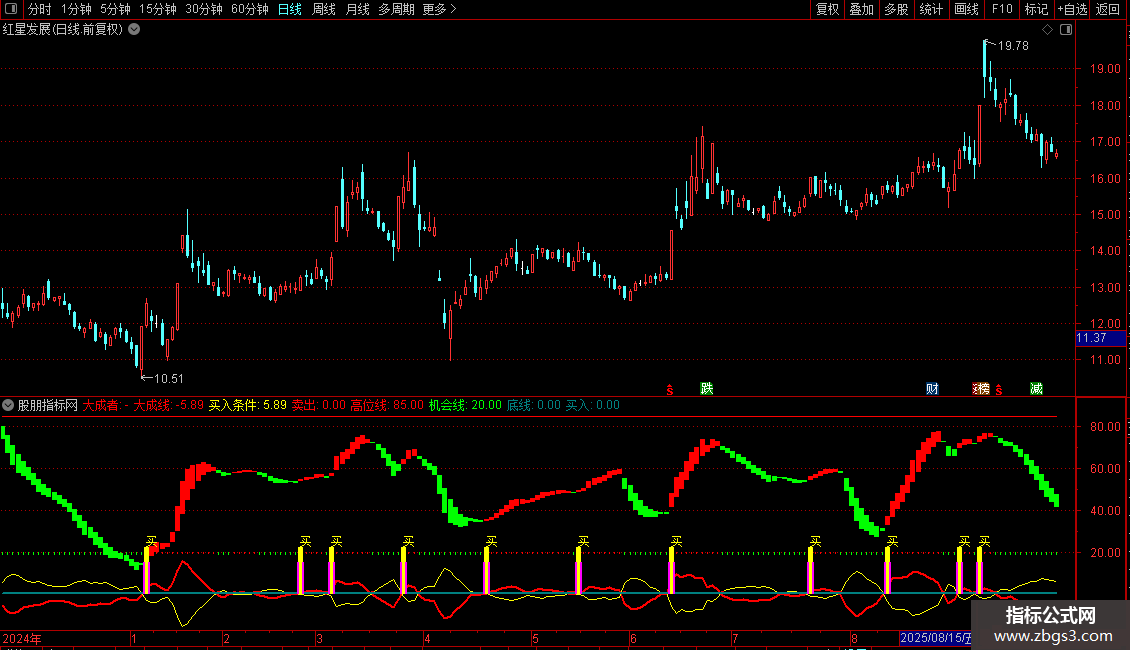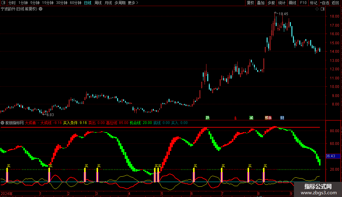ZBGS1:=HHV(HIGH,9)-LLV(LOW,9);ZBGS2:=HHV(HIGH,9)-CLOSE;ZBGS3:=CLOSE-LLV(LOW,9);ZBGS4:=ZBGS2/ZBGS1*100-70;ZBGS5:=(CLOSE-LLV(LOW,60))/(HHV(HIGH,60)-LLV(LOW,60))*100;ZBGS6:=(2*CLOSE+HIGH+LOW)/4;ZBGS7:=SMA(ZBGS3/ZBGS1*100,3,1);ZBGS8:=LLV(LOW,34);ZBGS9:=SMA(ZBGS7,3,1)-SMA(ZBGS4,9,1);ZBGS10:=IF(ZBGS9>100,ZBGS9-100,0);ZBGS11:=HHV(HIGH,34);ZBGS12:=EMA((ZBGS6-ZBGS8)/(ZBGS11-ZBGS8)*100,8);ZBGS13:=EMA(ZBGS12,5);大成者:DRAWNULL,COLORRED;STICKLINE(ZBGS12>0 AND ZBGS12-ZBGS13>=0,19,20,0,0),COLORRED;STICKLINE(ZBGS12>0 AND ZBGS12-ZBGS13< 0,19,20,0,1),COLORGREEN;大成线:ZBGS12-ZBGS13,COLORRED,LINETHICK2;STICKLINE(ZBGS12-ZBGS13>0,ZBGS12,ZBGS13,2,0),COLORRED;买入条件:-大成线,COLORYELLOW;STICKLINE(ZBGS12-ZBGS13< 0,ZBGS12,ZBGS13,2,0),COLORGREEN;卖出:REF(大成线,1)>0 AND 大成线<=0 OR (大成线< 1 AND 大成线>=0 AND CLOSE< OPEN),COLORRED;高位线:85,COLORRED,LINETHICK2;机会线:20,NODRAW,COLORGREEN;底线:0,COLORLICYAN,LINETHICK2;买入:卖出=0 AND REF(大成线,1)< 0 AND 大成线>0,COLORLICYAN;STICKLINE(买入,0,22,2,0),COLORYELLOW;加仓:STICKLINE(买入,0,15,5,0),COLORMAGENTA;STICKLINE(买入,0,15,1,0),COLORYELLOW;DRAWTEXT(买入,25,'买'),COLORYELLOW;