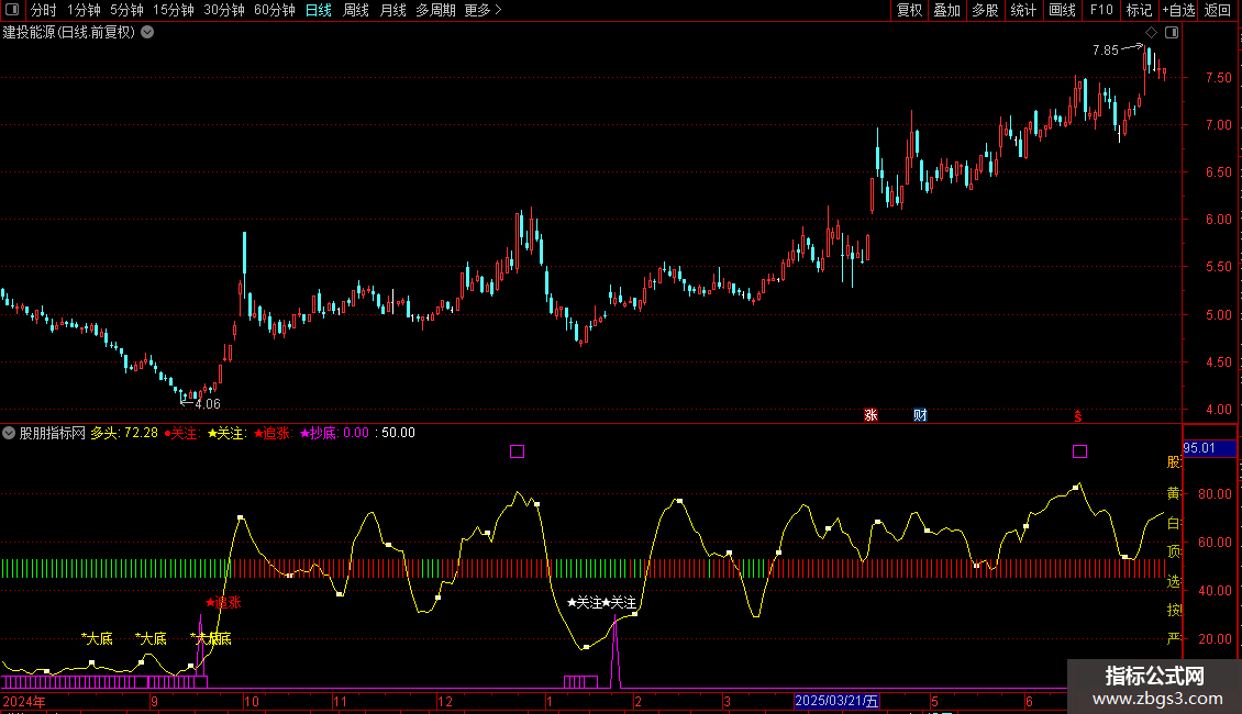 ★关注: DRAWTEXT(REF(CROSS(慢线,多头),82) AND 慢线>1.3*多头,35,'★关注'),LINETHICK1;