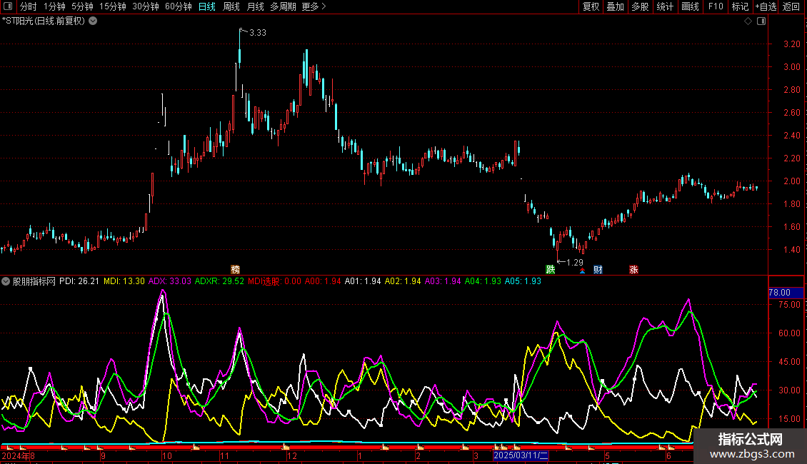 输出ADX:MDI-PDI的绝对值/(MDI+PDI)*100的M日指数平滑移动平均,线宽为2
