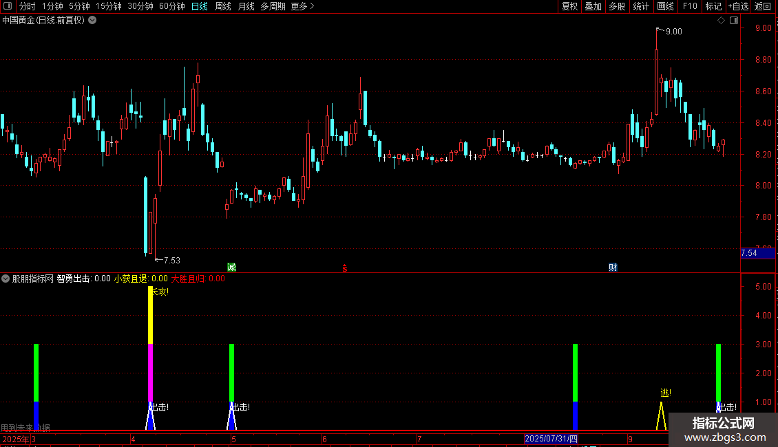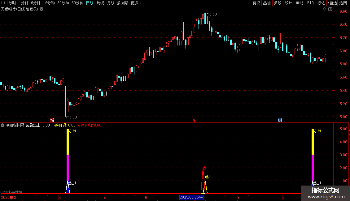 智勇出击: ZIG(3,6)>REF(ZIG(3,6),1)AND REF(ZIG(3,6),1)<REF(ZIG (3,6),2),COLORWHITE,LINETHICK2; DRAWTEXT(智勇出击=1,0.8,'出击!'),COLORWHITE;
