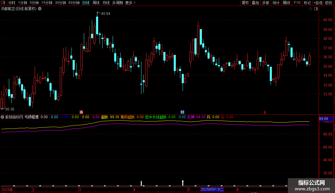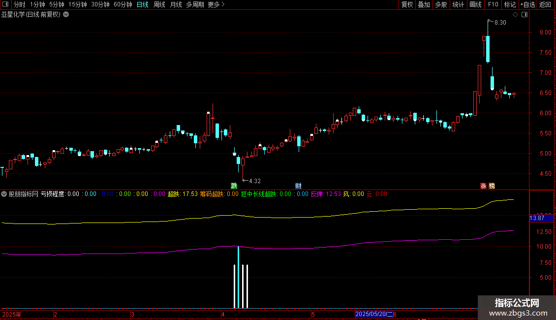 云:IF(超跌=反弹 AND CYS13<=-16 AND 筹码超跌=30 AND 短中长线超跌=40,-20,0),COLORRED,STICK,LINETHICK3;