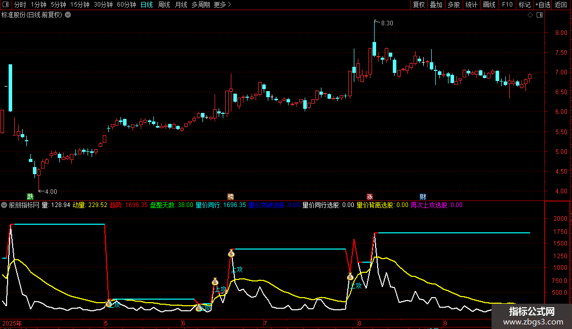 DRAWTEXT(量价突破选股>0,(量*0.699),'上攻'),COLORCYAN;