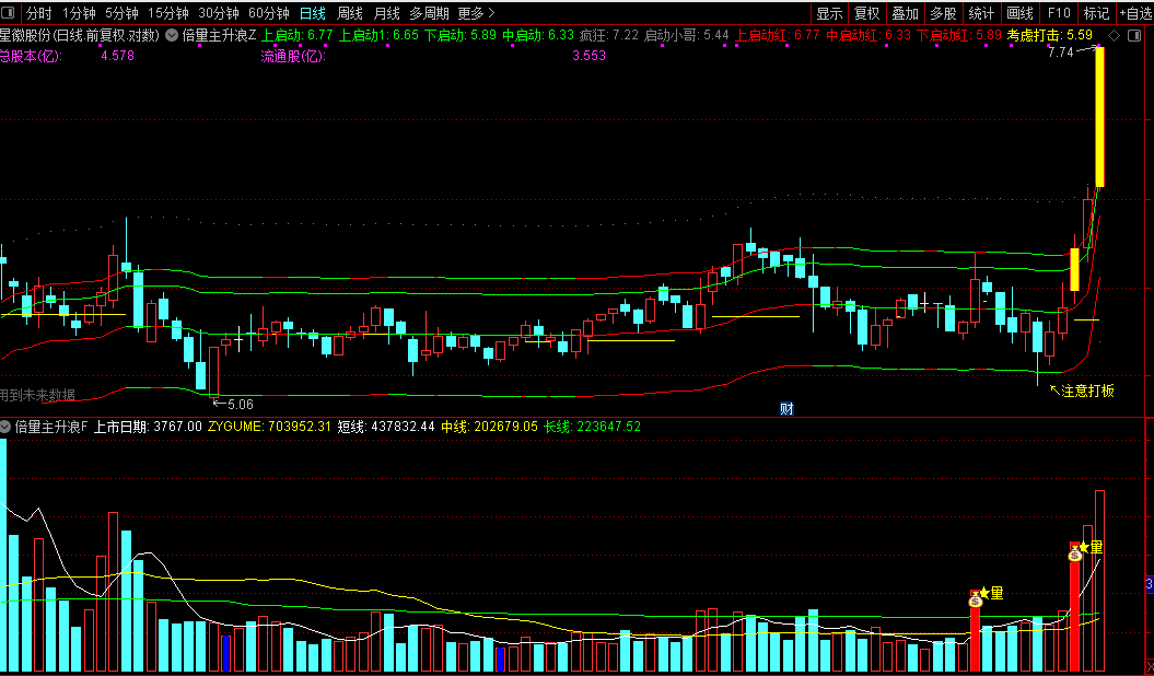 黄色涨停K线配合"注意打板"文字提示,标记强势启动信号