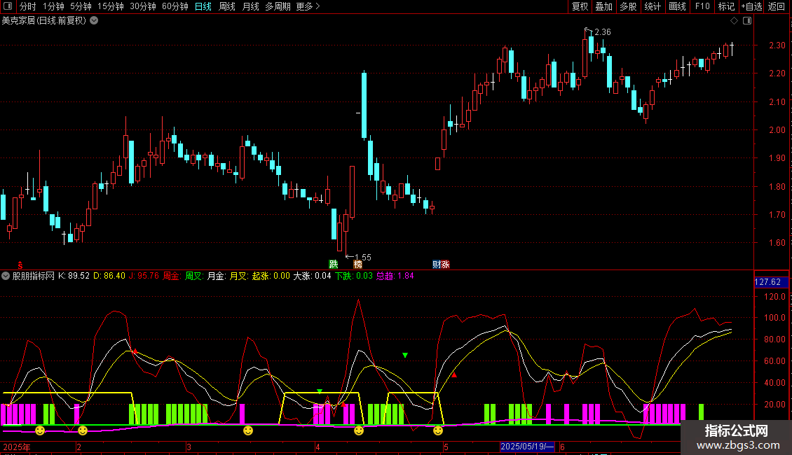 月金:DRAWTEXT(CROSS(REF(月K,1),REF(月D,1)) ,D,'▲'),COLORWHITE;
