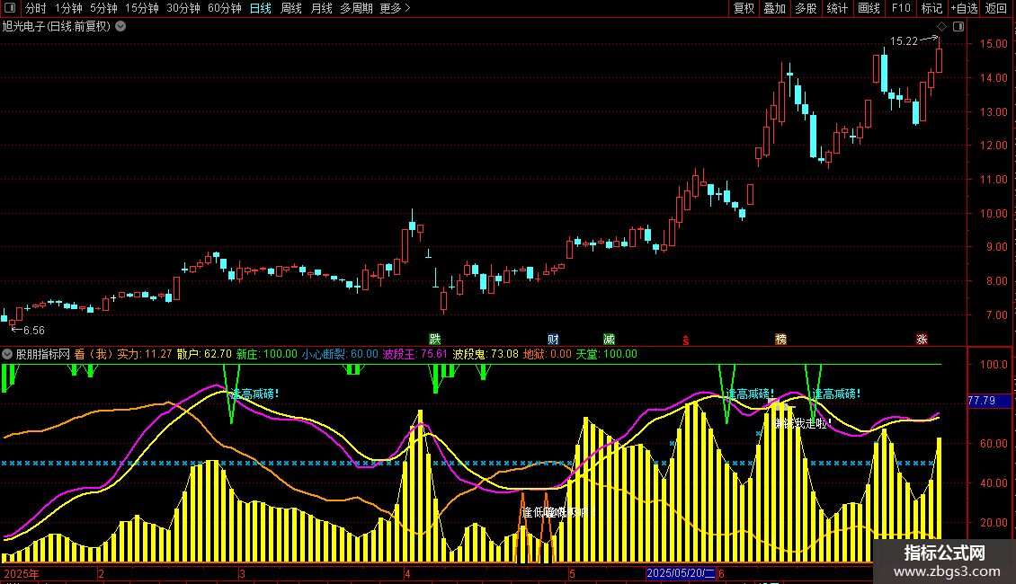 DRAWTEXT(CROSS(波段鬼,波段王) AND 波段鬼>75,85,'逢高减磅!'),COLORFFFF00 , ;