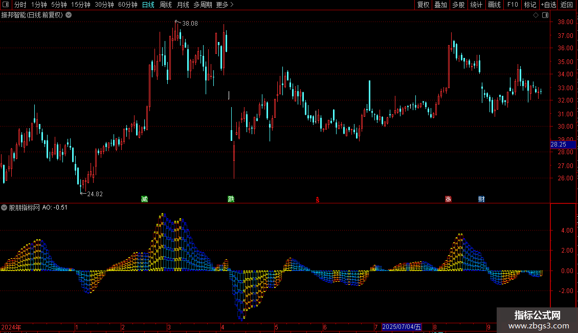 STICKLINE(AO>=REF(AO,1),(AO-AO*0.6),(AO-AO*0.75),5,-1) COLOR00CCFF;