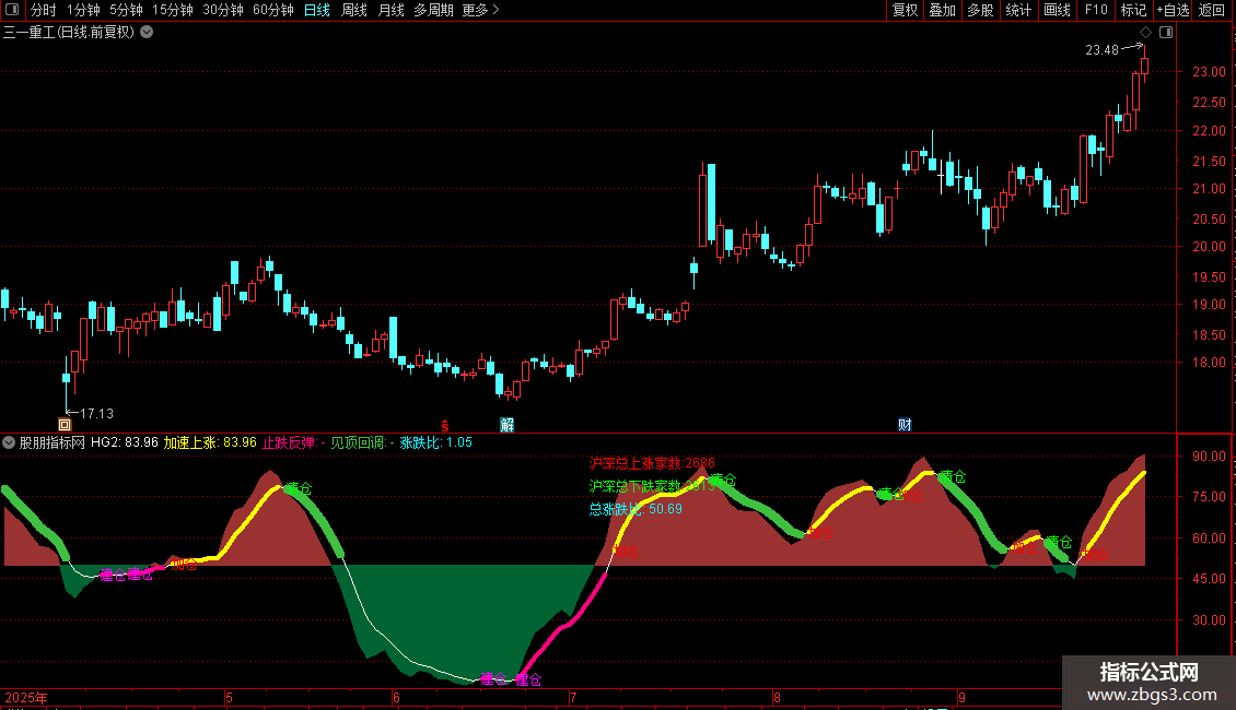 上涨趋势:=IF(HG1>50,HG1,DRAWNULL),COLORRED;