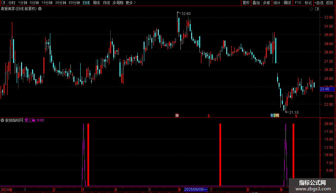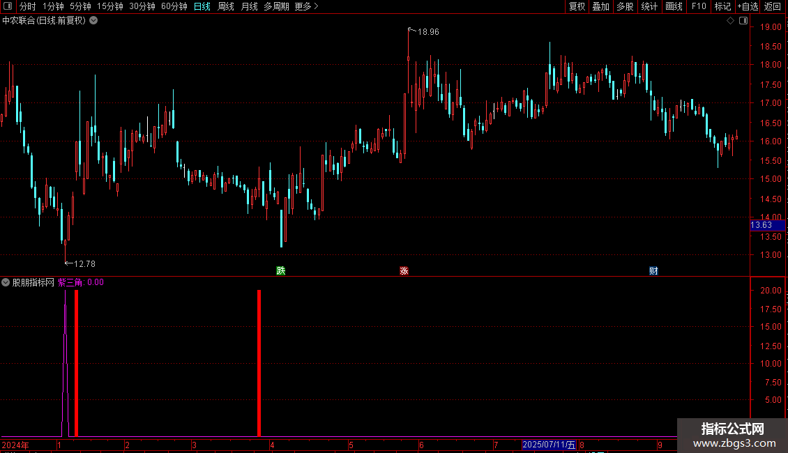 紫三角:IF((COUNT((DD>REF(DD,1)),1)=1) AND (REF(DD,1)<REF(REF(DD,1),1)) AND (DD<跟踪),20,0),COLORF00FF0;