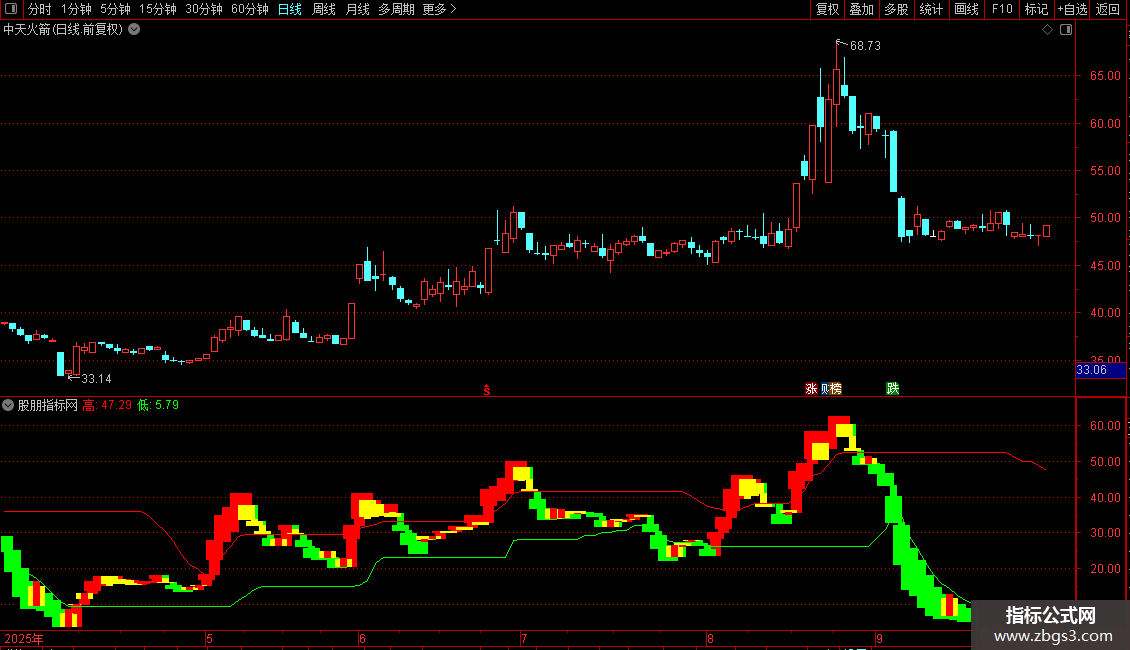 介必升:=(CLOSE-LLV(LOW,21))/(HHV(HIGH,21)-LLV(LOW,21))*1.2*CLOSE;老介1:=EMA(介必升,4);老介2:=EMA(介必升,6);老介3:=EMA(介必升,8);STICKLINE(老介1>=老介2,老介3,老介1,8,0),colorred;STICKLINE(老介1>=老介2,老介3,REF(老介1,1),5,0),colorred;STICKLINE(老介1<老介2,老介3,老介1,8,0),colorgreen;STICKLINE(老介1<老介2,老介3,REF(老介1,1),3,0),colorgreen;T1:=老介2>=老介3 AND 老介1<REF(老介1,1);T2:=老介2<老介3 AND 老介1>REF(老介1,1);STICKLINE(T1,老介1,老介3,8,0),COLOR00FFFF;STICKLINE(T1,老介1,REF(老介3,1),3,0),COLOR00FFFF;STICKLINE(T2,老介1,老介3,8,0),coloryellow;STICKLINE(T2,老介1,REF(老介3,1),3,0),colorred;高:HHV(EMA(介必升,13),21),colorred,Linethick1;低:LLV(EMA(介必升,10),21),colorgreen,Linethick1;