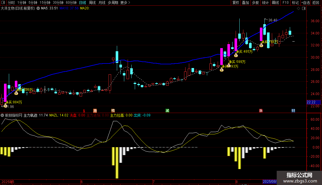 输出MAZL:主力轨迹的N2日简单移动平均,画黄色