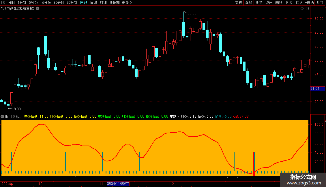 年涨: (CLOSE-REF(C,YEAR))/REF(C,YEAR)*100,POINTDOT,COLORWHITE;