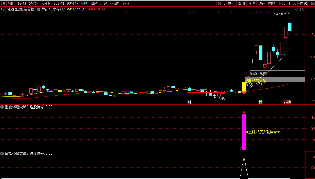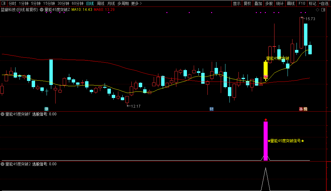 通达信【量能45度突破】主副/选指标短期趋势加速型共振指标价格趋势陡峭度源码