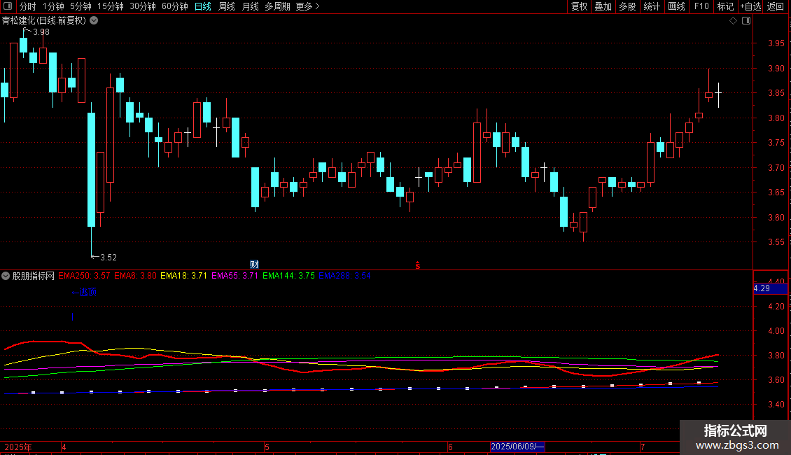 输出 EMA288:收盘价的288日简单移动平均,画蓝色