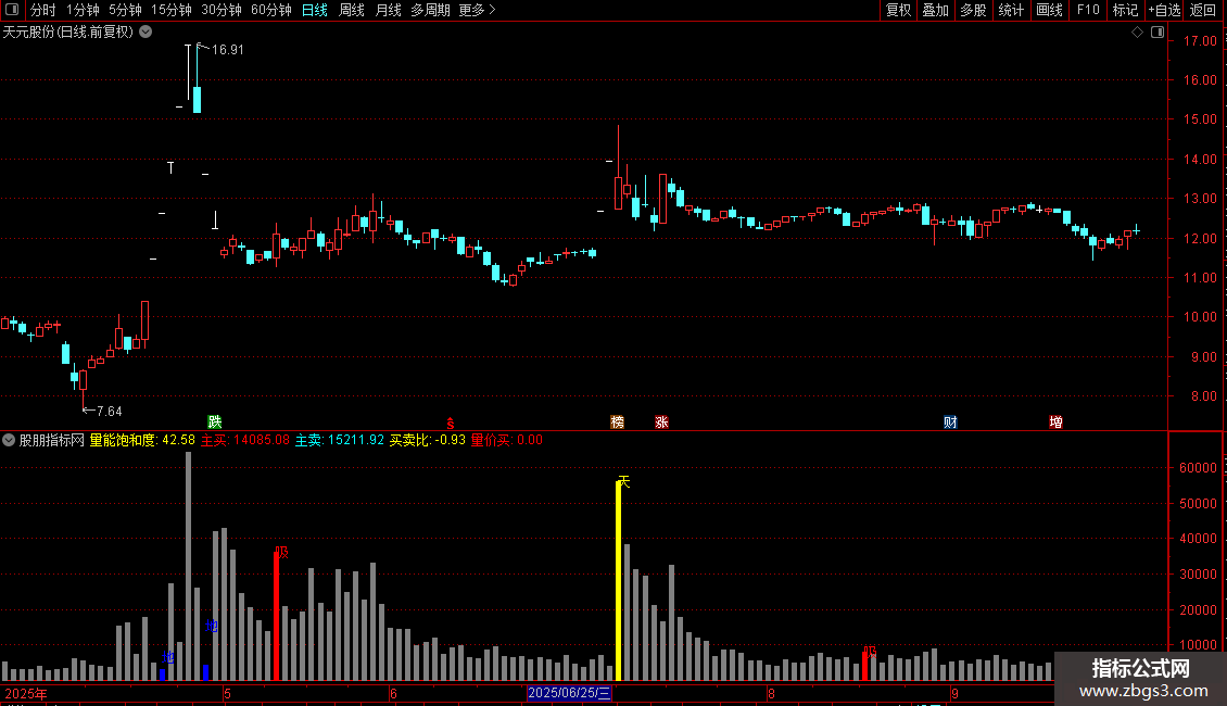 DRAWTEXT (VOL<MA(VOL,5)/2 AND V<V12/2,(V5+V)/2,'地'),COLORBLUE;