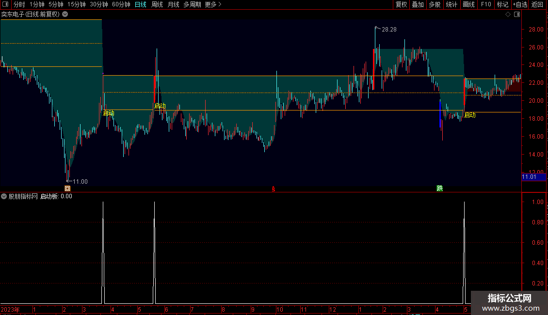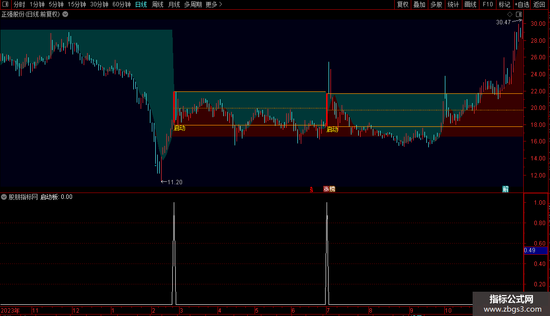 启动板:FILTER(MAXBYH<REF(MAXBYH,1) AND C>REF(L,1),5);