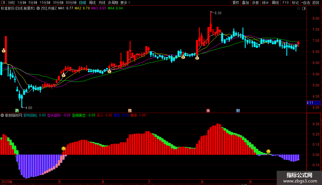 2、双红共振强确认:主图与幅图指标双重验证,当主图均线呈现多头排列形态,且幅图红色柱体持续放大时,突破前高位置自动显示"Q袋子"买入确认图标,强化交易信号可靠性。